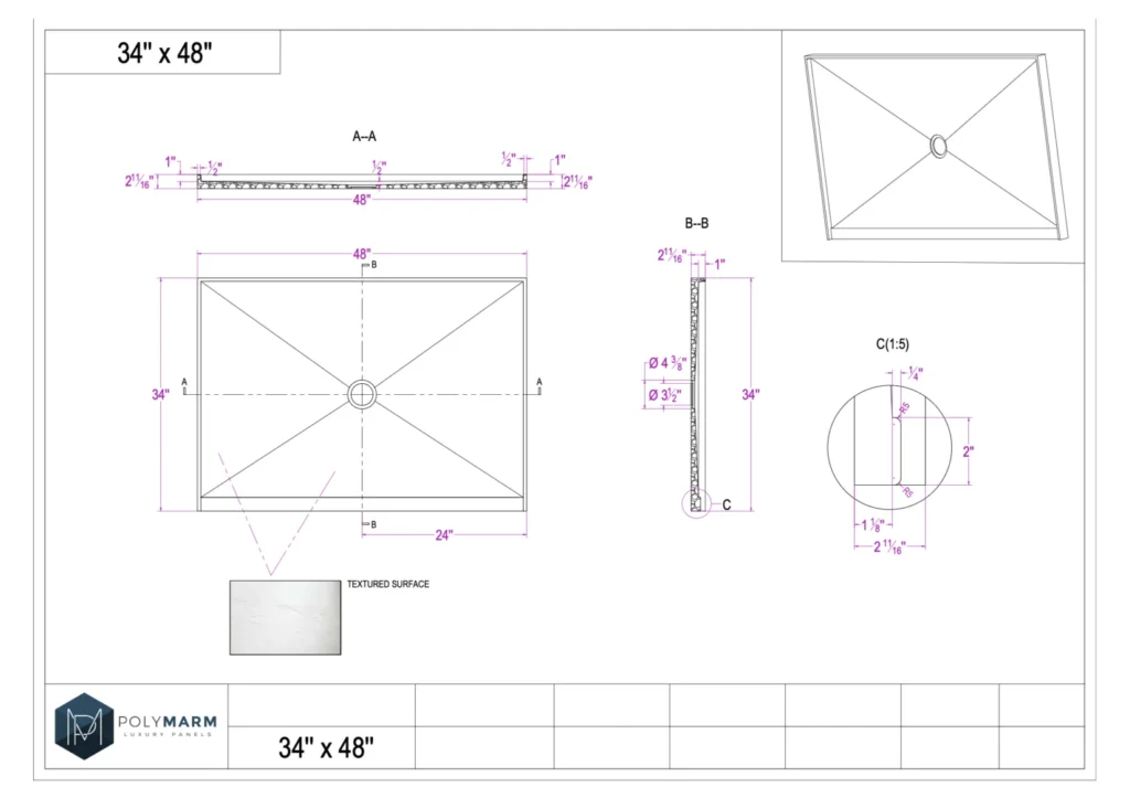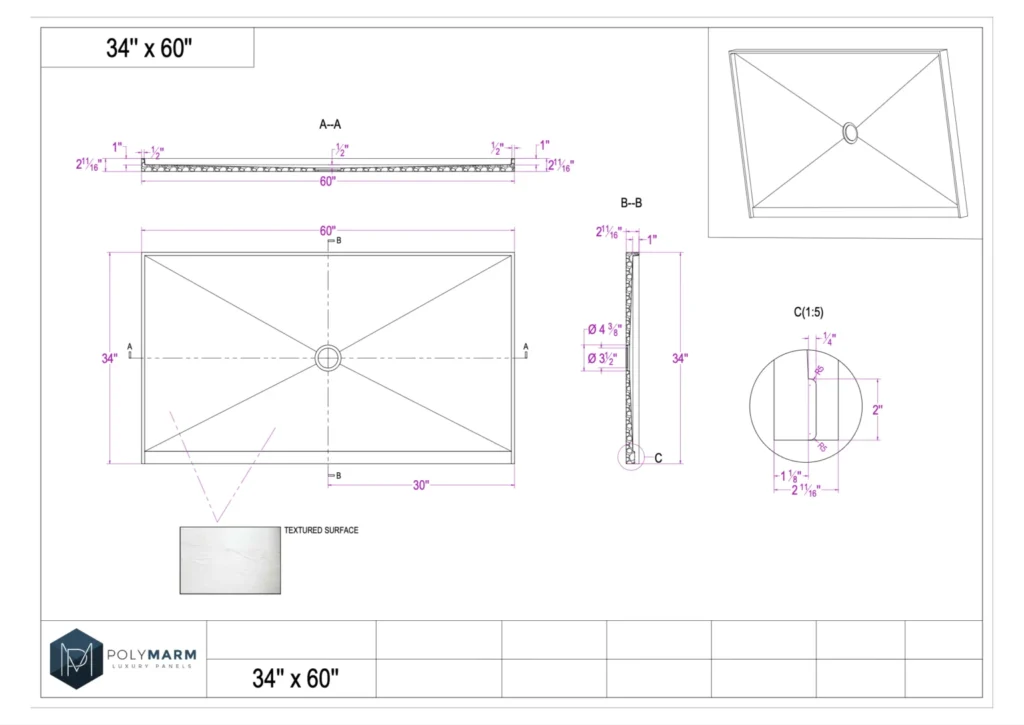 Explore our detailed shower pan drawings to review dimensions, layout, and installation details before you purchase. Each drawing is designed for clarity and accuracy, making planning and coordination easy.Available in 60″ × 34″ and 48″ × 34″ sizes.